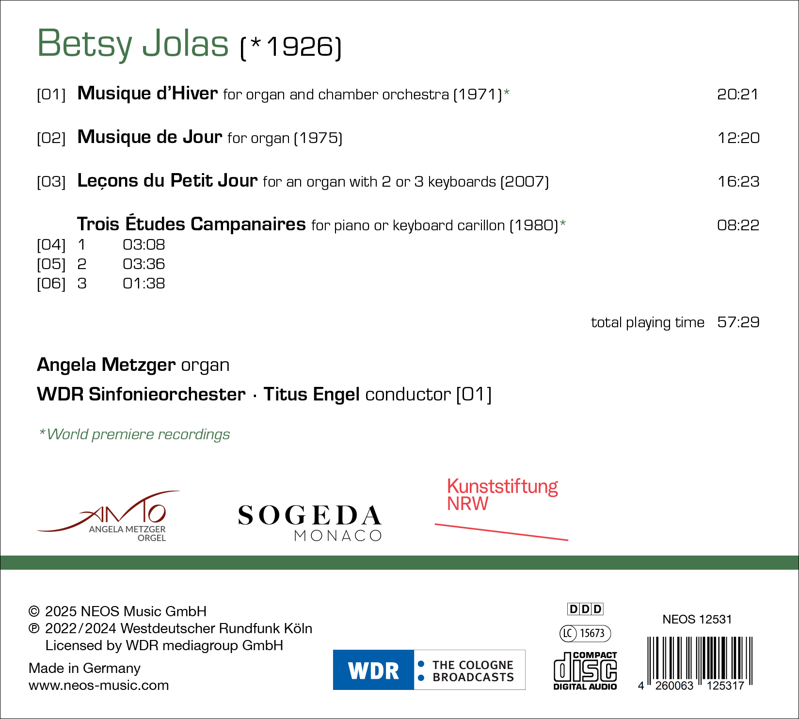 Interpretin ist die vielfach ausgezeichnete Organistin Angela Metzger, die Jolas’ Klangwelt mit großer Sensibilität und technischer Präzision zum Leben erweckt. Musique d’Hiver spielte sie mit dem WDR Sinfonieorchester unter der Leitung von Titus Engel ein.